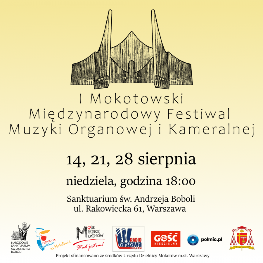 jest mi niezmiernie miło zaanonsować i zaprosić wszystkich melomanów, turystów, mieszkańców stolicy i przyjaciół Narodowego Sanktuarium na pierwszą edycję Mokotowskiego Międzynarodowego Festiwalu Muzyki Organowej i Kameralnej.