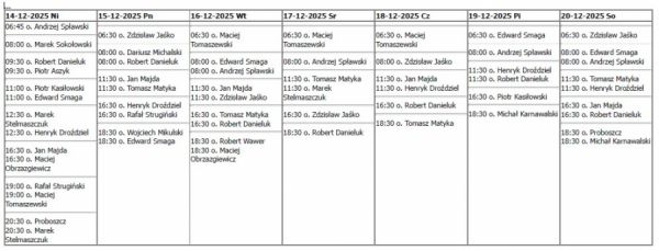 poniedziałek-sobota: 6:45-9.15, 11.30-12.15, 16.30-17.15, 18.30-19.15